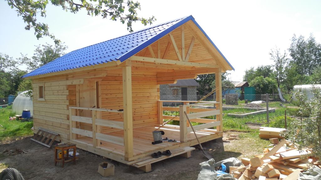 Качественное строительство бани 5х3 осуществляется за максимально короткое время. Монтаж фундамента ленточного и столбчатого типов осуществляется с системой надежной гидроизоляции. Планировка здания проста: 2 функциональных помещения, одно окно, один вход, крытая веранда для отдыха в теплое время года. Для внутренней каркасной бани под ключ применяется древесина хвойных пород. Кровля крыши выполнена при помощи оцинкованного профнастила.