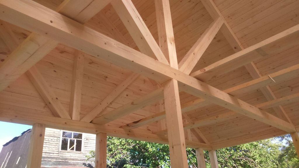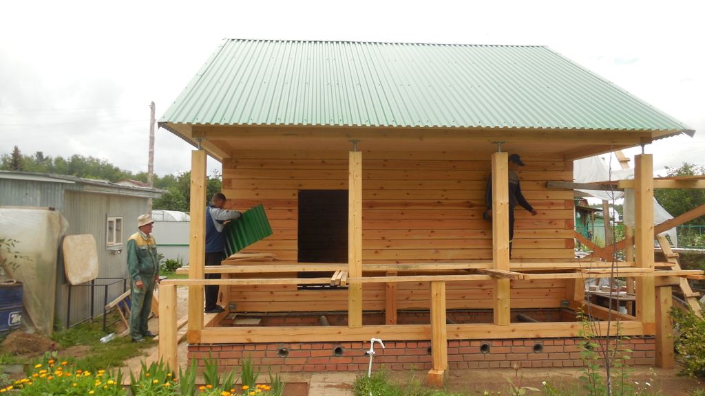 | Профнастил оцинкованный по стропилам из пиломатериала сечением 50х100мм с шагом 600мм. Обрешетка обрезная доска 22х100мм. Карнизы шириной 300мм подшиты вагонкой толщиной 16мм | |