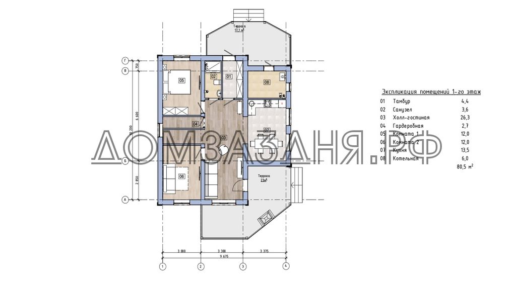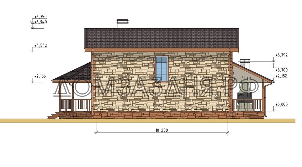 Дом габаритами 10.20 х 9.67 м с комфортным планировочным решением и двумя террасами.